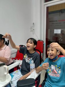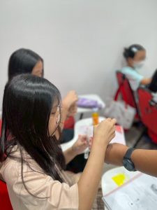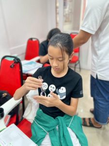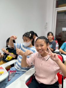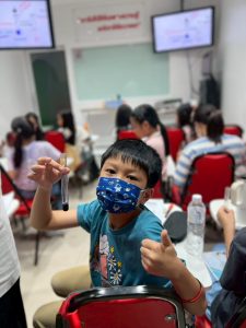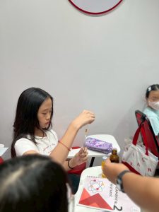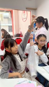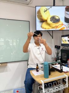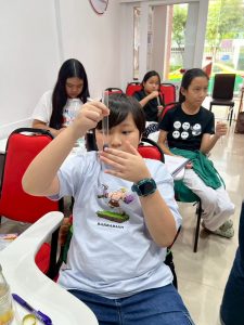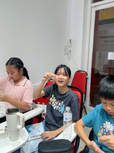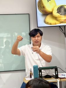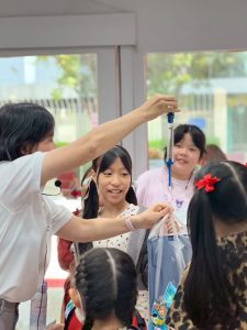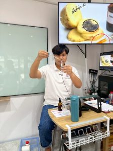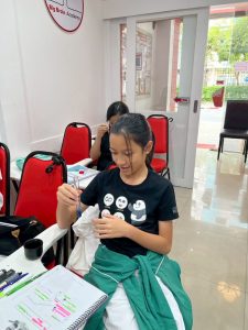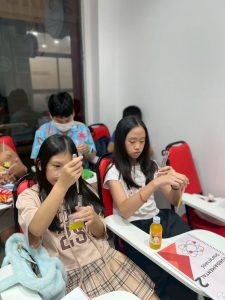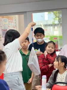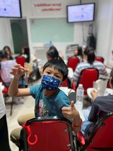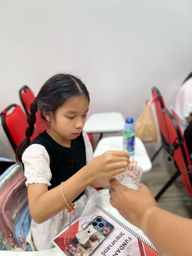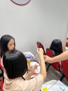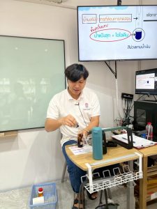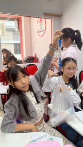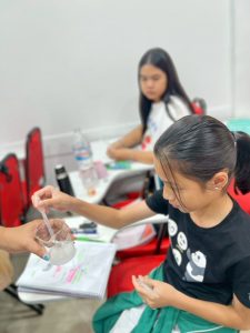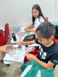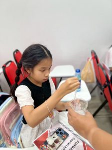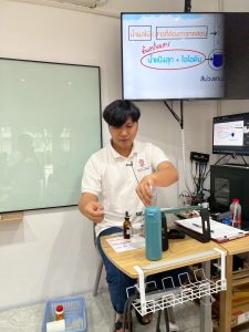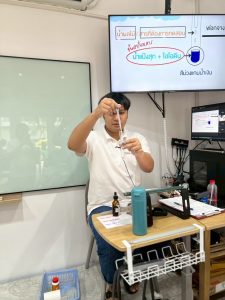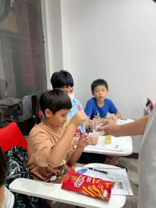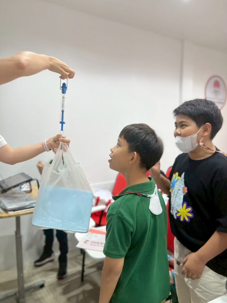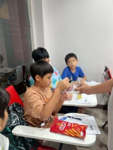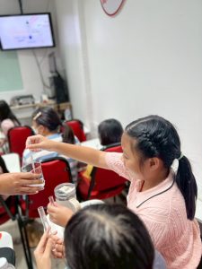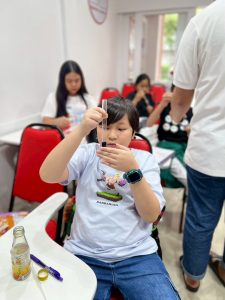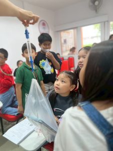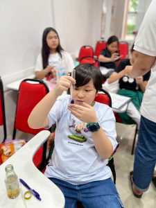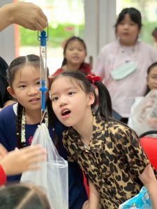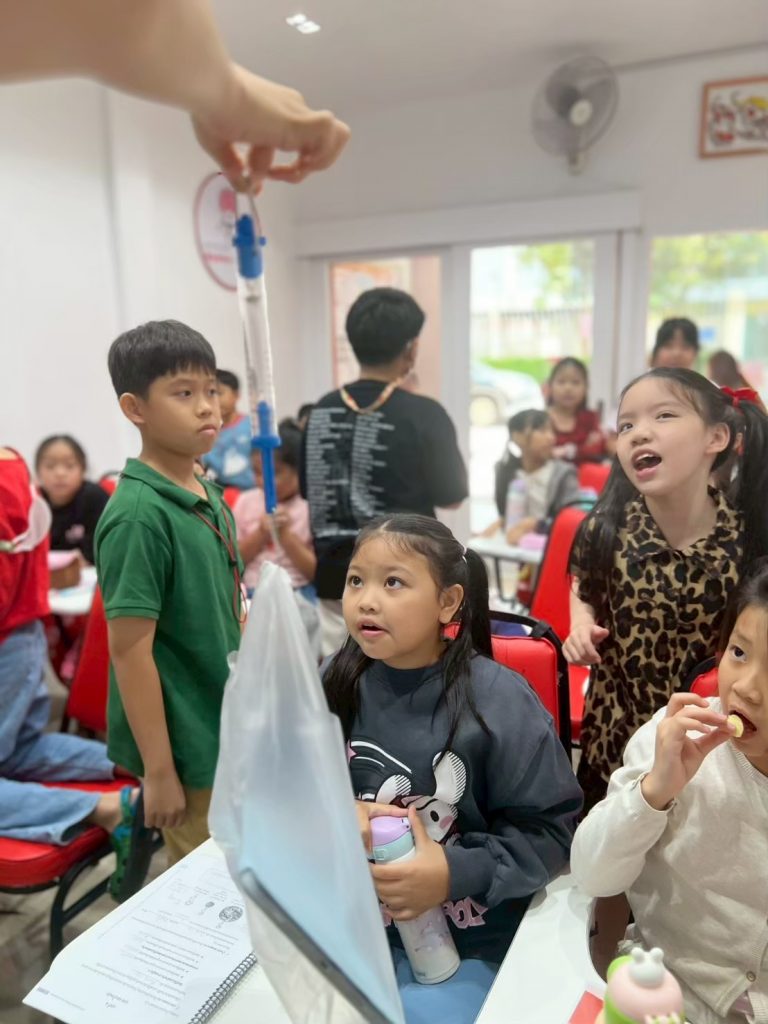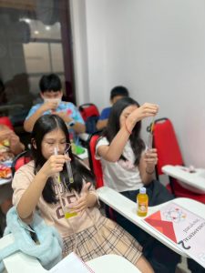 ต่อด้วยการทดลองวัดปริมาณวิตามินซีจากของใกล้ตัวที่น้องๆเตรียมกันมา เช่น น้ำส้ม น้ำมะนาว และน้ำต่าง ๆ เด็ก ๆ ได้ฝึกบีบ คั้น หยด และสังเกตปฏิกิริยาเคมีอย่างใกล้ชิด พร้อมเข้าใจว่าทำไมร่างกายต้องการวิตามินซี และอาหารชนิดใดให้ประโยชน์มากที่สุดด้วยค่ะ