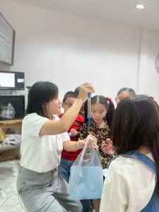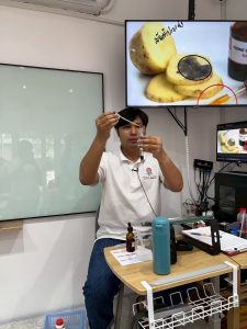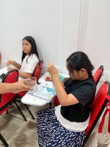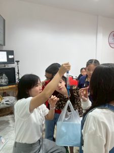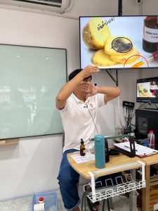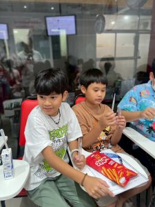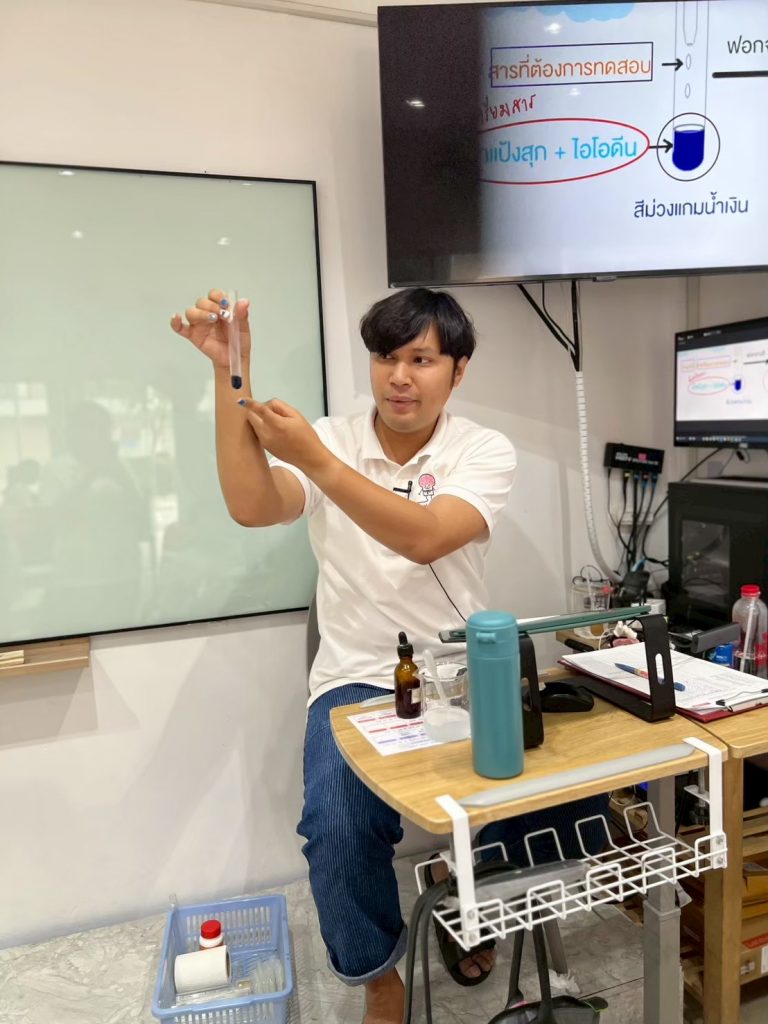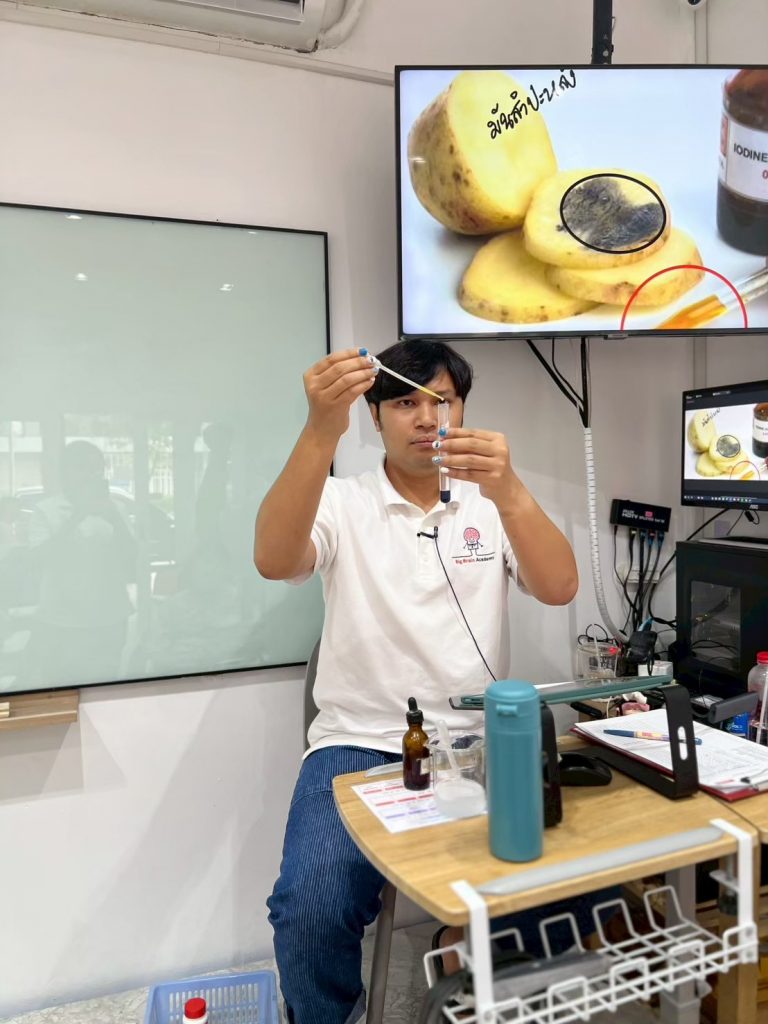 กิจกรรมเปิดฉากด้วยการทดลองทดสอบแป้ง โดยน้อง ๆ ได้ใช้สารละลายพิเศษหยอดลงบนแป้งชนิดต่าง ๆ เพื่อสังเกตการเปลี่ยนสี พร้อมเรียนรู้ว่าสารละลายใดแสดงว่า “มีแป้ง” หรือ “ไม่มีแป้ง” เด็ก ๆ สนุกกับการเดาและตรวจสอบผลลัพธ์เองอย่างตื่นเต้นเลยค่ะ
