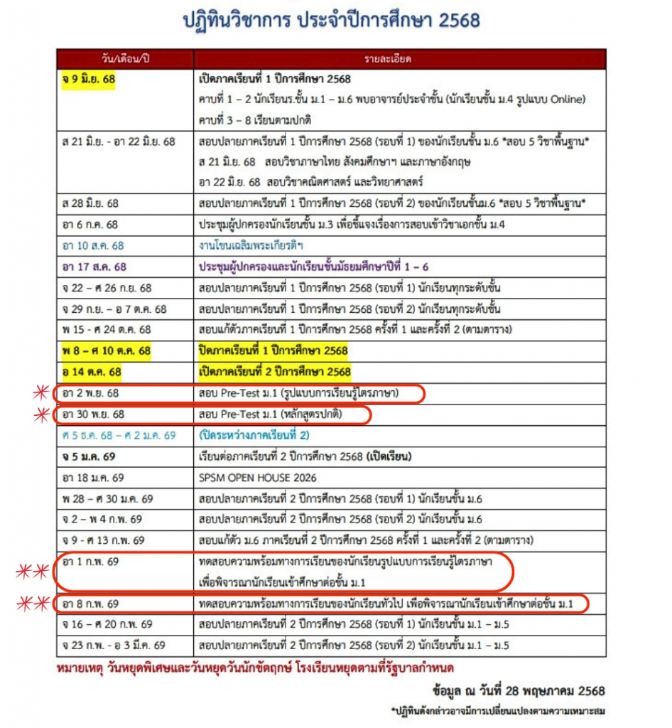 **วันที่กำหนดการอาจมีการเปลี่ยนแปลงอัพเดทได้ที่เว็บไซต์ของโรงเรียน คลิกที่นี่
